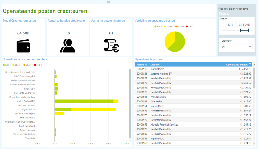 Krijg inzicht in de openstaande posten van crediteuren. Bekijk de verdeling van de openstaande posten op basis van de categorieën 30-60-90 dagen. Je kunt hierbij de volgende filters gebruiken: