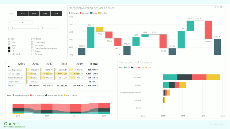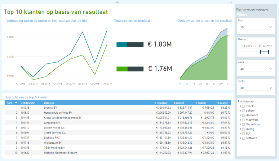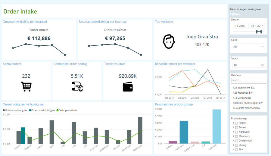 Analyseer de orderstroom en visualiseer de ontwikkeling van omzet en marge op orders. Krijg snel antwoord op de vraag welke verkoper de meeste marge realiseert en zet dit af tegen de andere verkopers. Je kunt hierbij de volgende filters gebruiken: