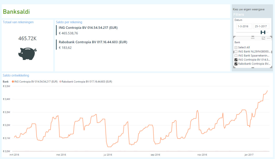 Zie in één oogopslag wat het totaalsaldo van je bankrekeningen is en krijg grafisch inzicht in het verloop van uw banksaldo/-saldi over de tijd. Je kunt zelf kiezen van welke rekening(-en).