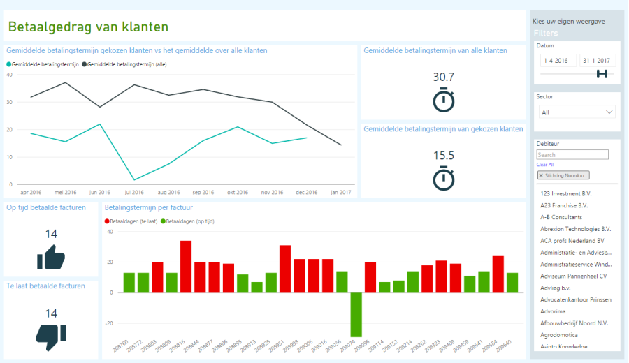 Analyseer het betaalgedrag van klanten en krijg inzicht hoe individuele klanten presteren ten opzichte van alle klanten of de sector waartoe ze behoren. Leer hoeveel en welke facturen binnen of buiten de afgesproken betalingstermijn zijn voldaan en wat de gemiddelde betaaltermijn is van je klant(-en).