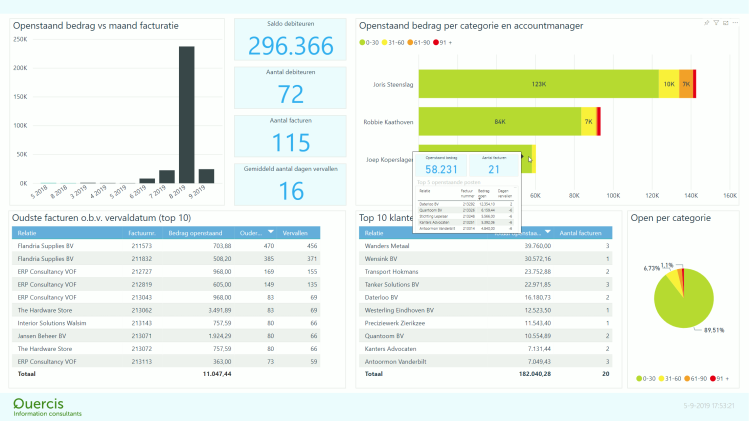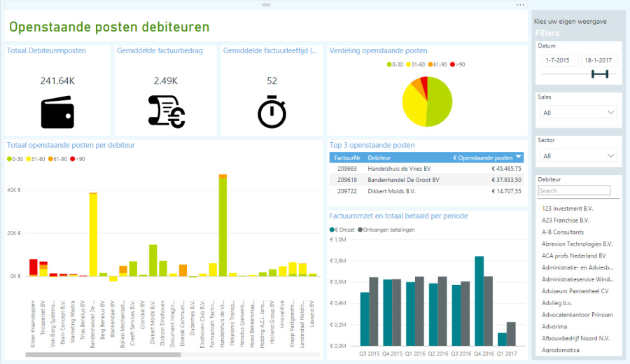Krijg inzicht in de openstaande posten van debiteuren en volg de ontwikkeling van de omzet en ontvangen betalingen per periode, klant en verkoper. Bekijk de verdeling van de openstaande posten op basis van de categorieën 30-60-90 dagen en toon de 3 grootste openstaande facturen. Je kunt hierbij de volgende filters gebruiken: