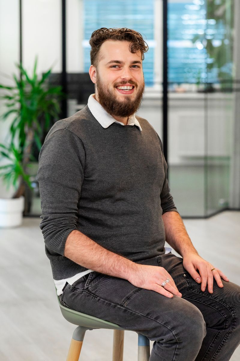 “Ik heb hiervoor ICT & Business gedaan, op de Fontys. In het eerste jaar, dacht ik er over na om software engineer te worden. Dan ben je meer bezig aan de achterkant, met coderen en bouwen. Je hebt alleen te maken met bepaalde betrokkenen. Op het moment dat je ICT en Business volgt, focus je je meer op de consultant rol, op het functioneel beheer en het testen. Dan zit je meer met de klant aan tafel. Ik kom met klanten in aanraking én ik overleg met de mensen die aan de achterkant zitten. Ik zit er eigenlijk een beetje tussenin. Dat spreekt me erg aan. Ik wil mezelf niet alleen bezighouden met bedrijfsprocessen, maar ook niet alleen met de techniek. En hier krijg je de ruimte om portalen te bouwen, maar ook om een klant het IFR portaal uit te leggen. Dus ik zit goed op mijn plek.”